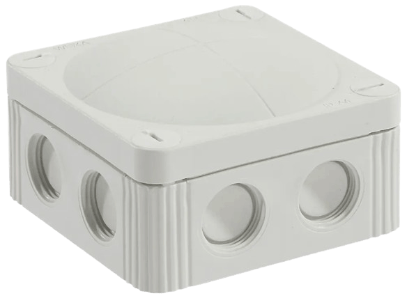 Stænktæt forskruningsdåse med gevindhuller til indføring og samling af kabler.